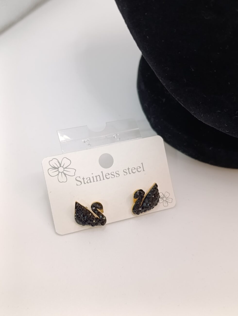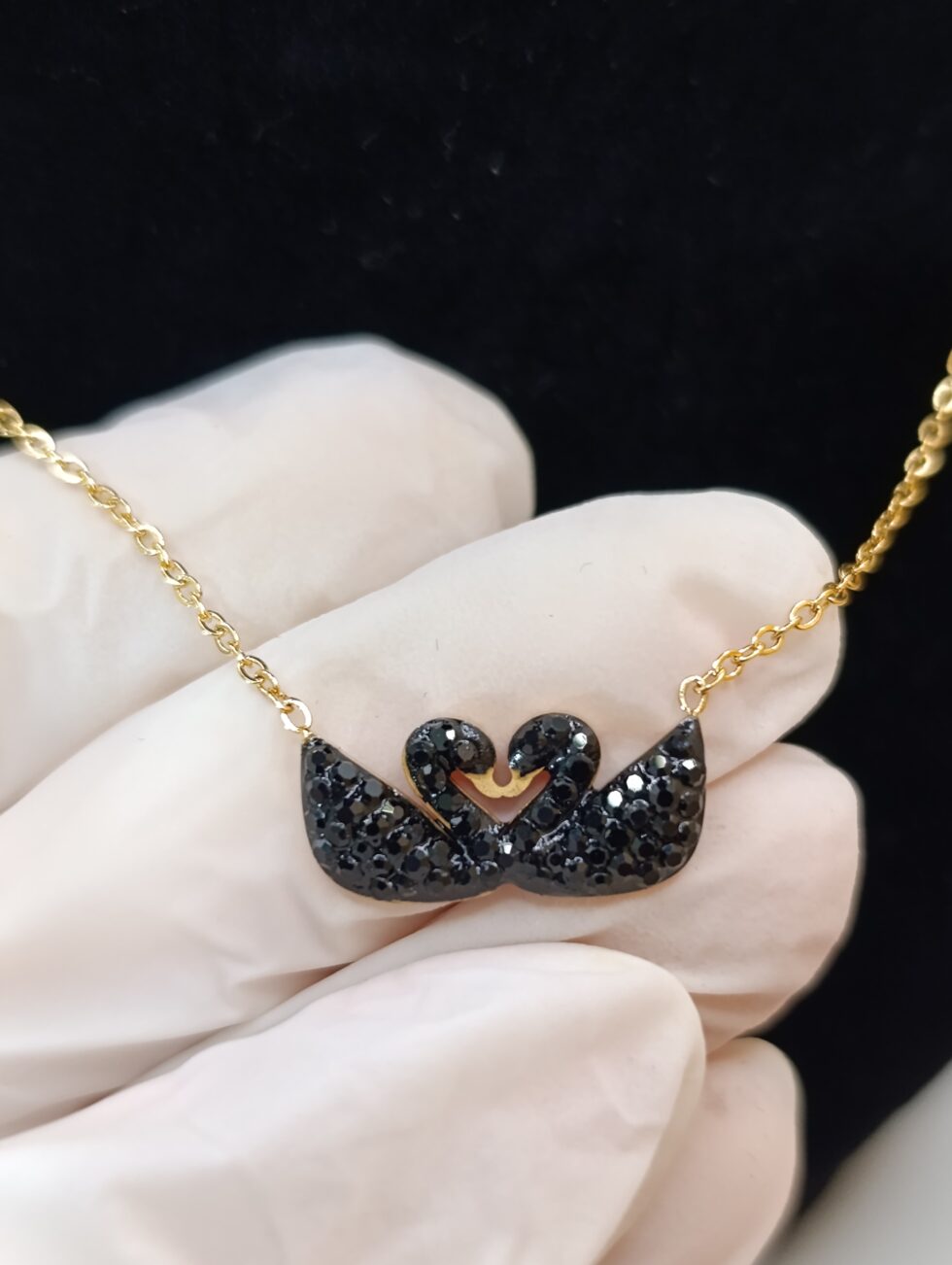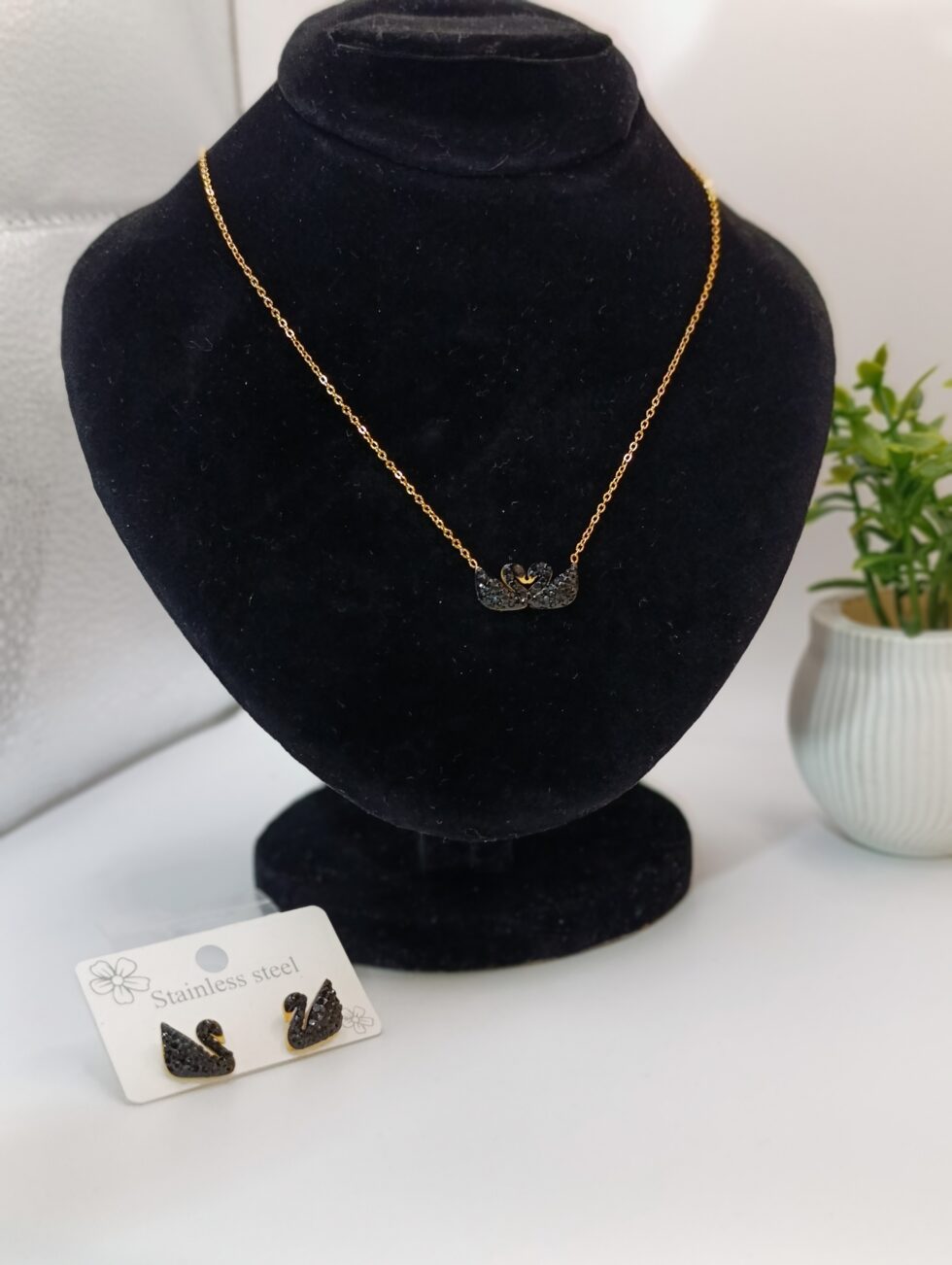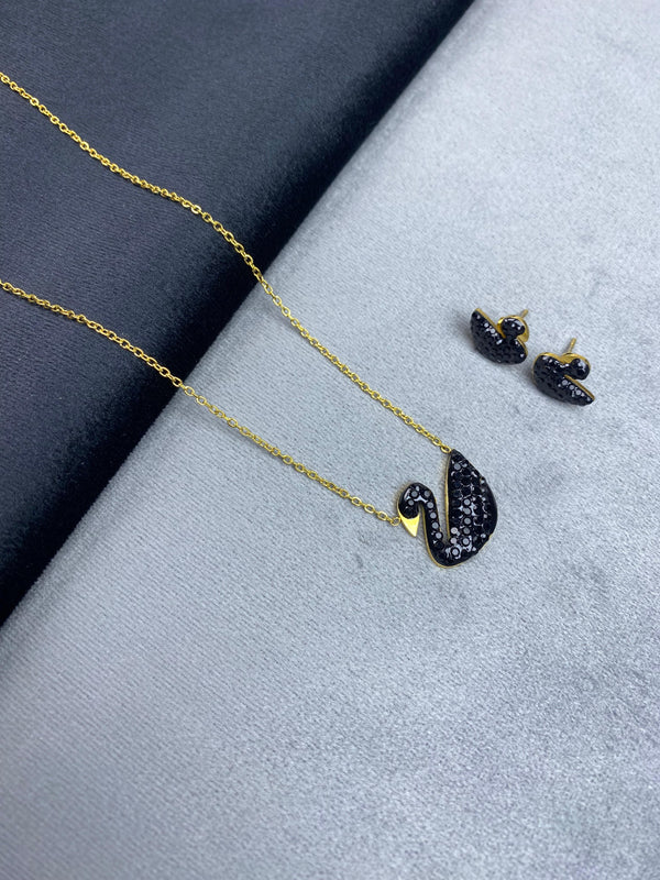 Add modern luxury to your everyday style with the Black Swan Pendant Set. Featuring a graceful swan design adorned with black stones on a sleek gold-toned chain and matching stud earrings.