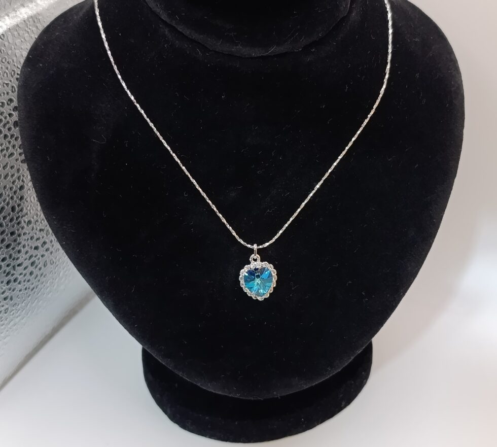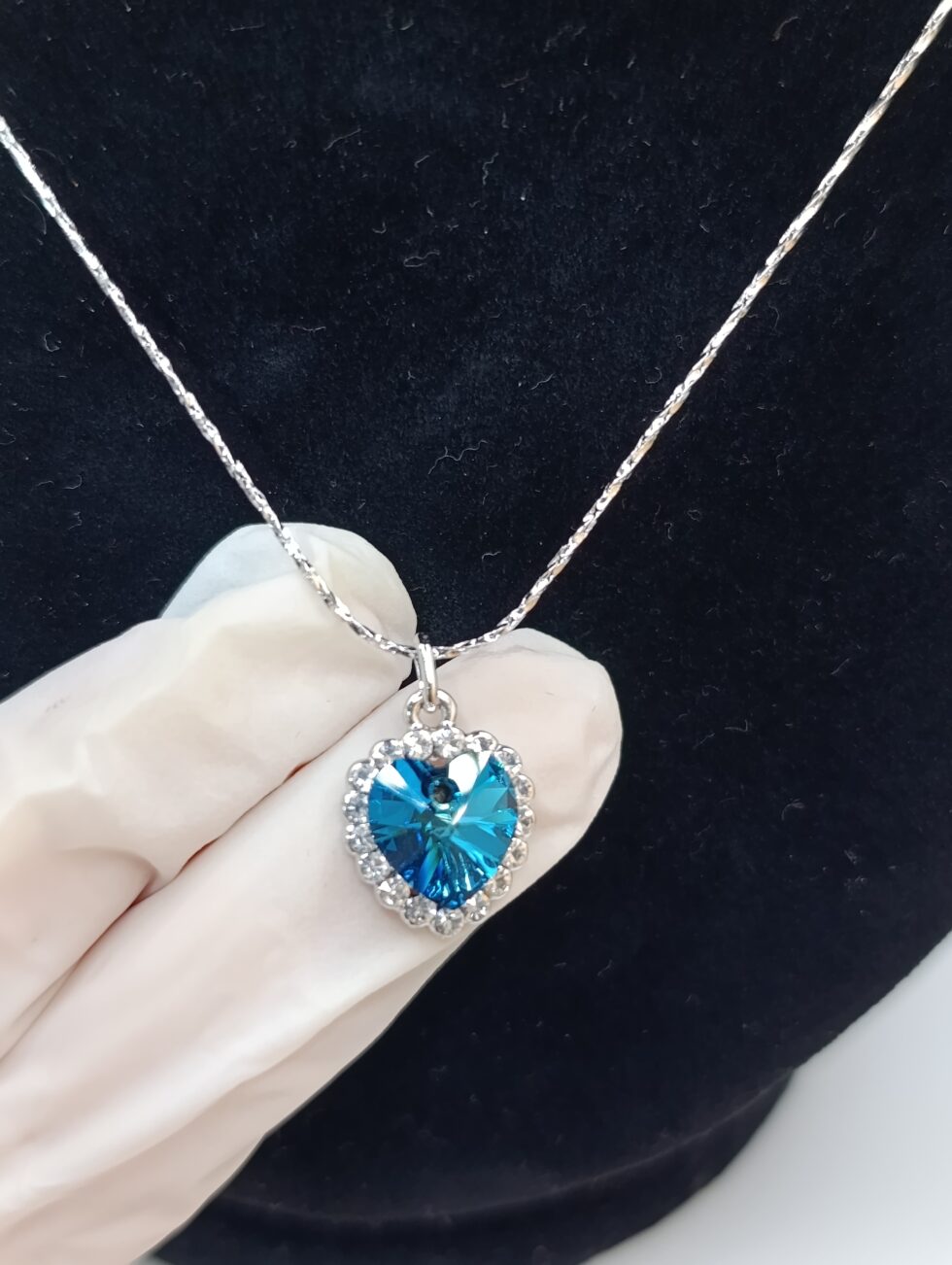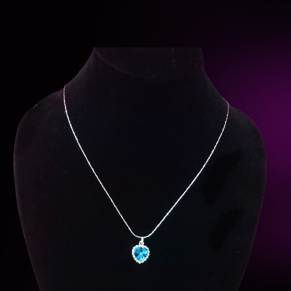 Elevate your style with this eye-catching Blue Crystal Heart Pendant, featuring a shimmering heart-cut blue crystal surrounded by a halo of white stones, this piece offers the perfect mix of charm and sparkle for daily wear or gifting.
