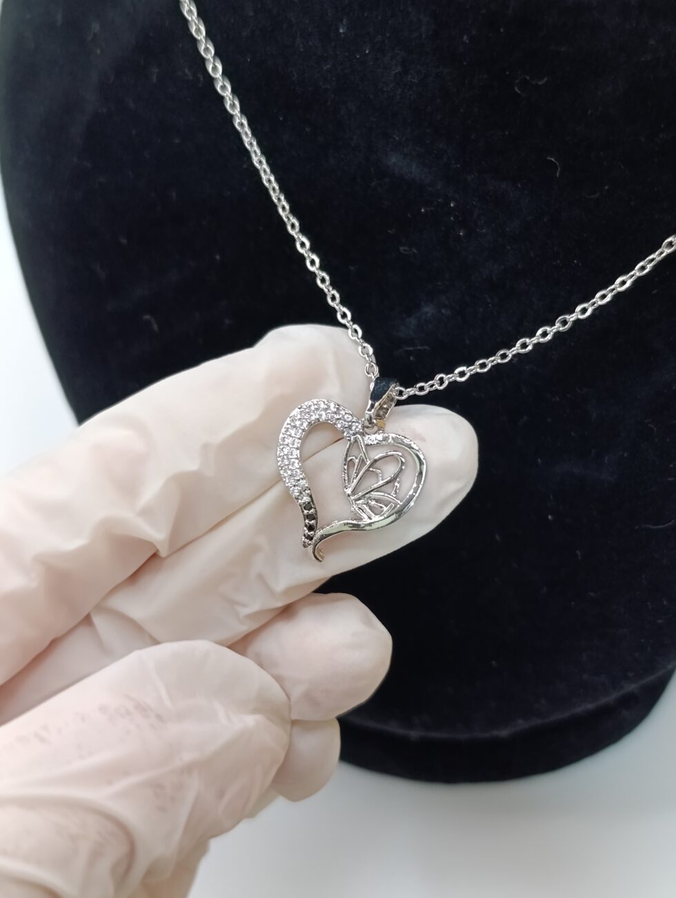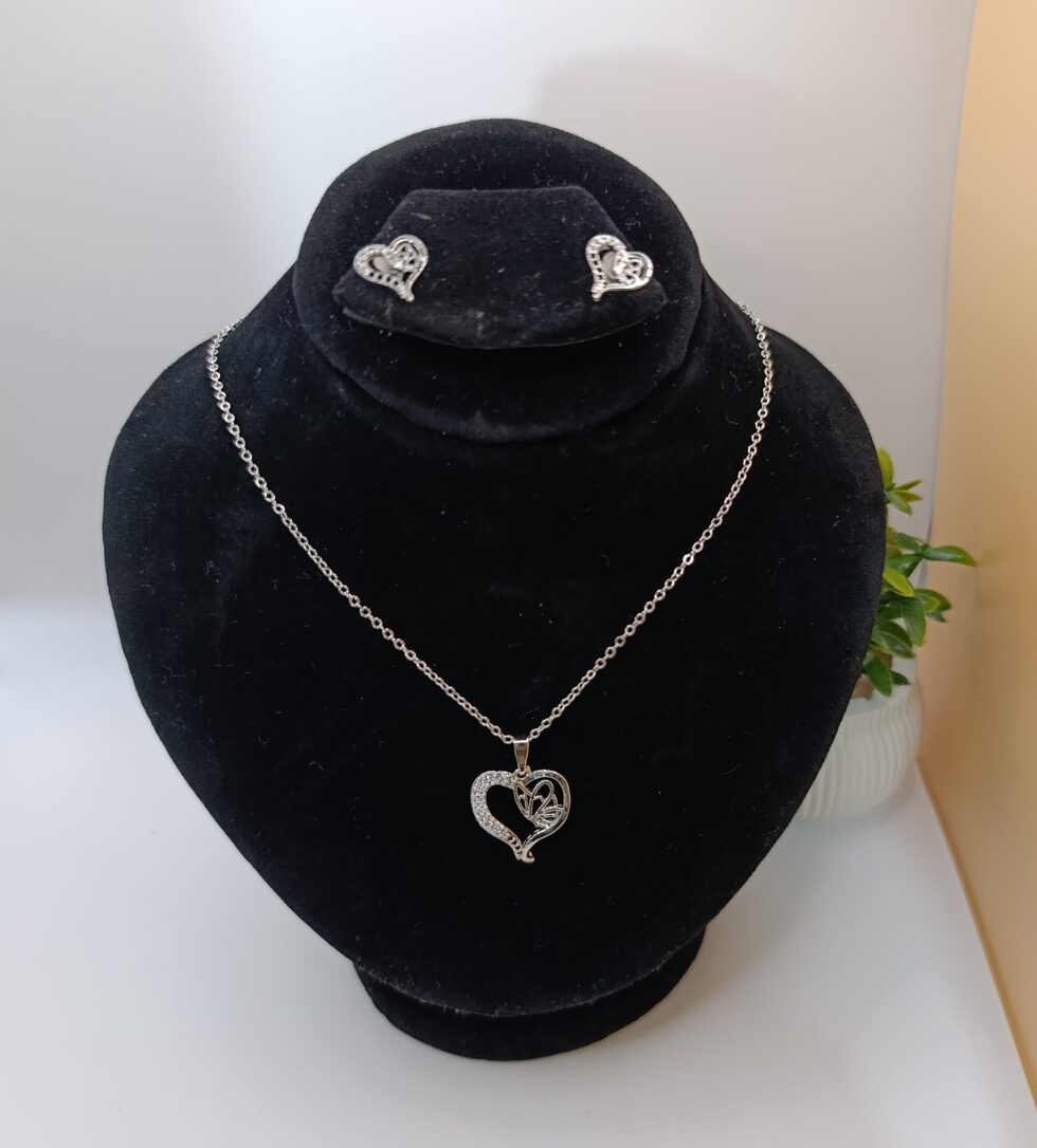 The heart-shaped pendant features an embedded floral motif, complete with matching stud earrings. An ideal gift or statement for romantic dinners, birthdays, or casual elegance.