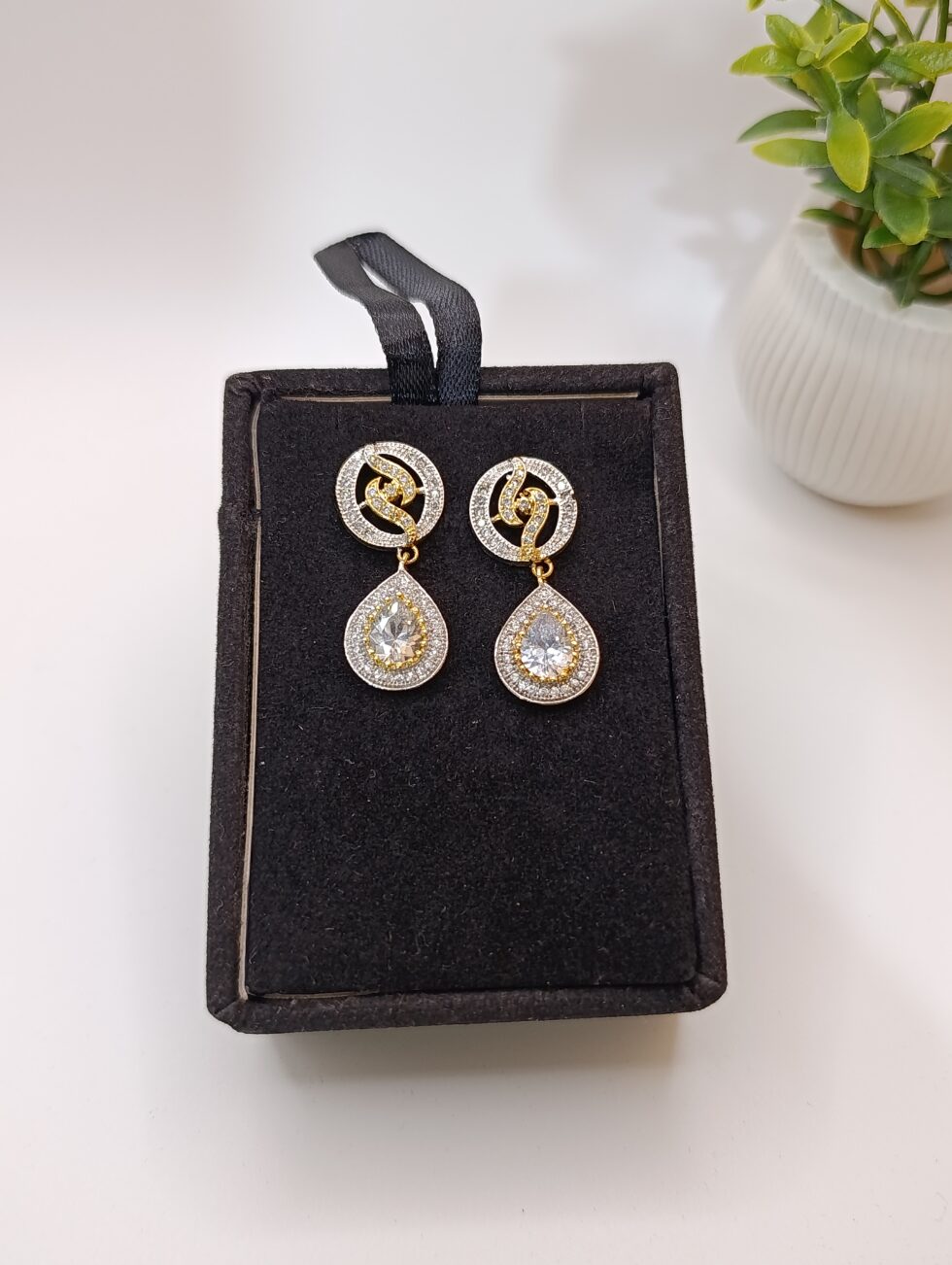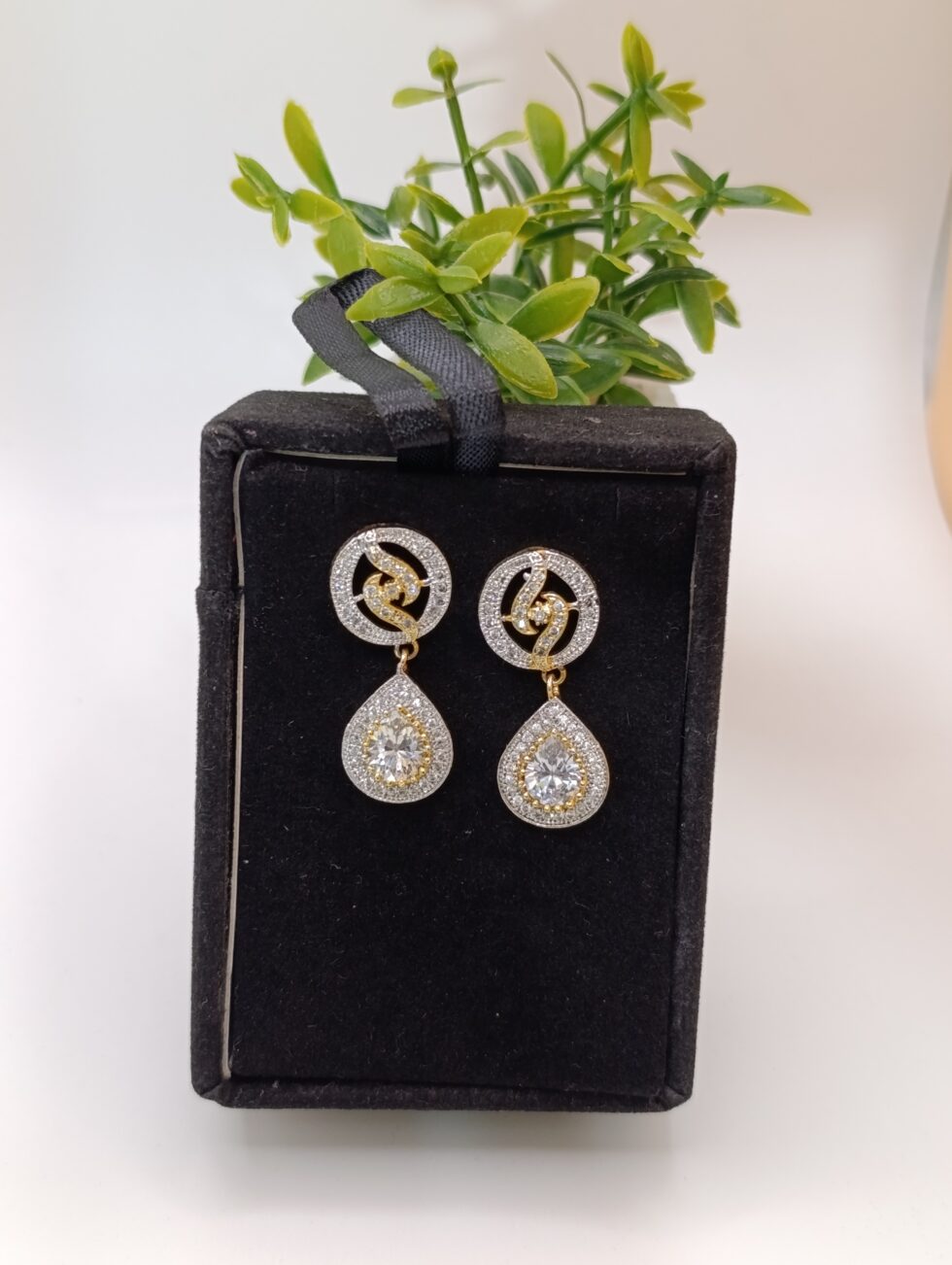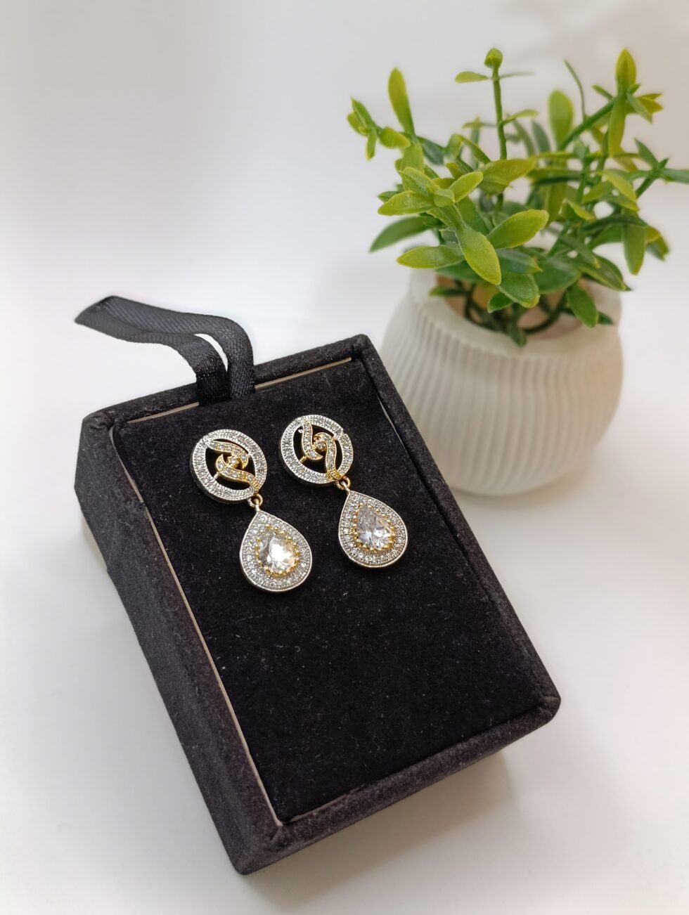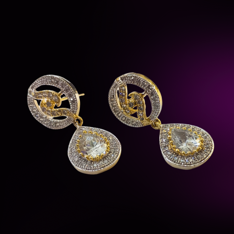 Turn heads with Bazellaz’s Golden Zircon Drop Earrings, featuring a unique circular top design and sparkling teardrop zircon centers.