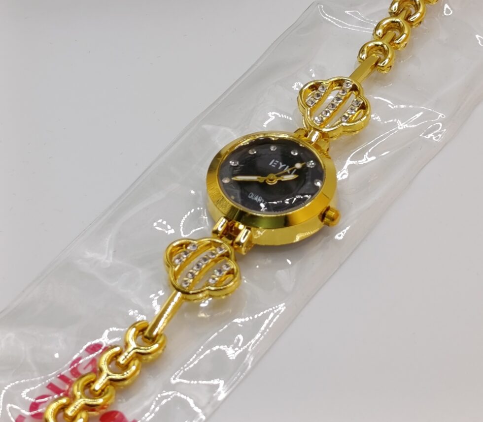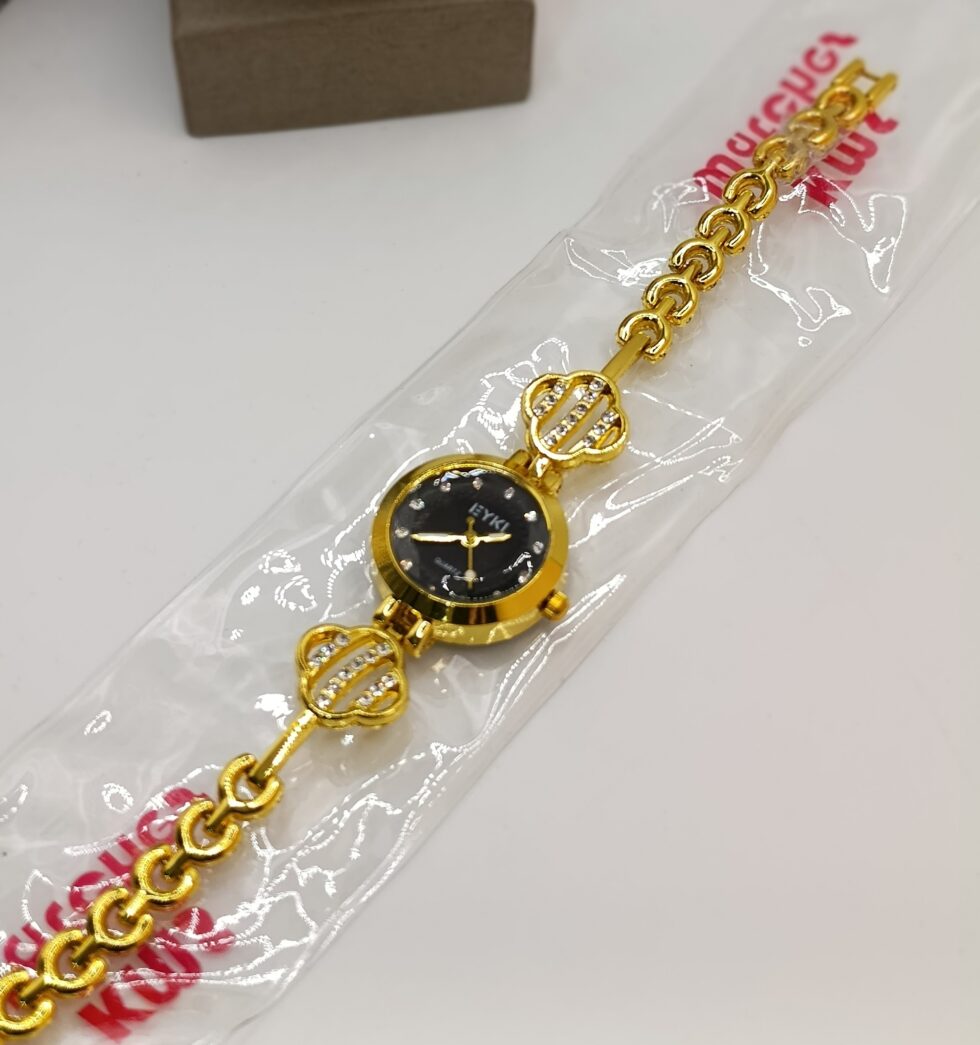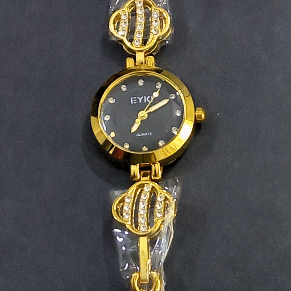 Step into timeless sophistication with the EYKI Golden Ladies Watch. This quartz timepiece features a rich gold-tone frame, a bold black dial, and crystal-studded floral links, perfect for formal occasions or classy everyday wear.