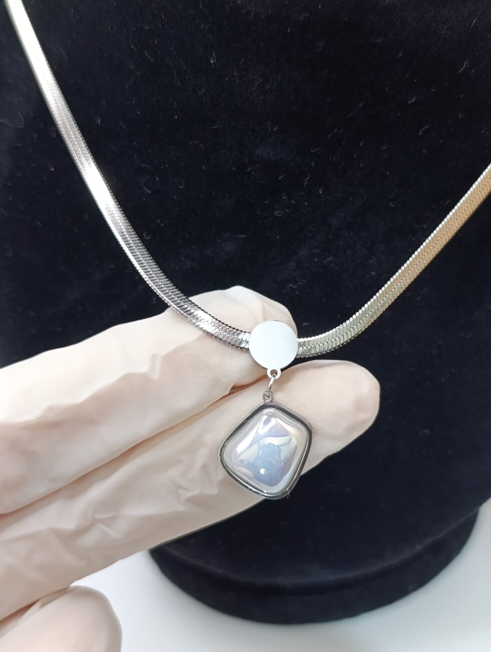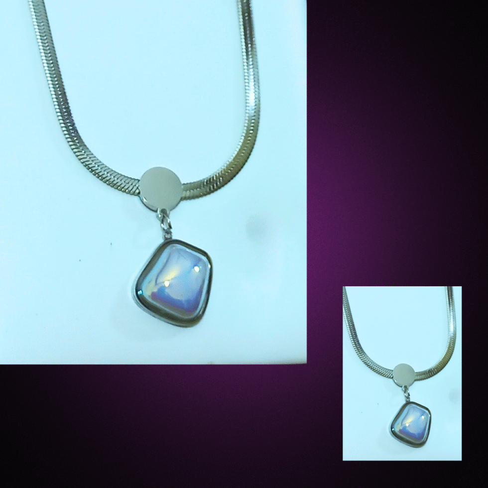 A sleek silver snake chain meets a uniquely shaped iridescent stone for a bold yet minimalist statement, perfect for everyday wear or pairing with modern evening looks.